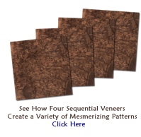 Quad Matching - A combination of book matching and butt matching in which four or more veneers are laid up side by side and end to end. As with book matching, this can create the most interesting patterns. To do this, you will need four sequential veneers. Play around with the rotation of the veneers to find the most pleasing or outrageous pattern. Cut and join two sets of two veneers using the technique above. Then use a veneer saw to cut the mating edges of the bookmatched pair to get a clean joint line for the final edge (making the quad match).